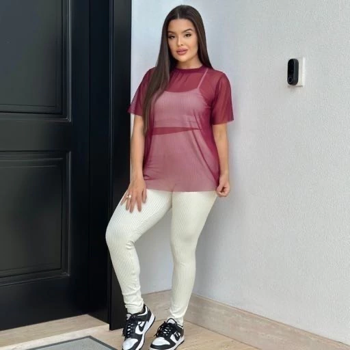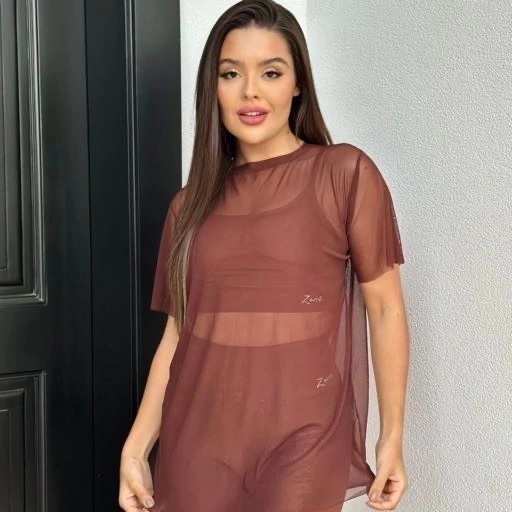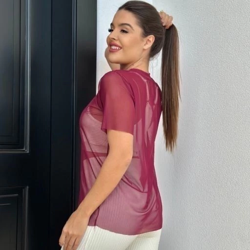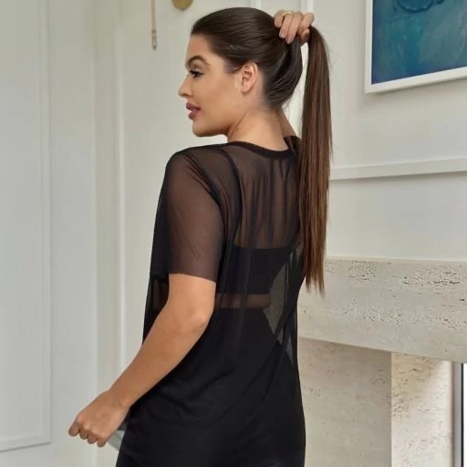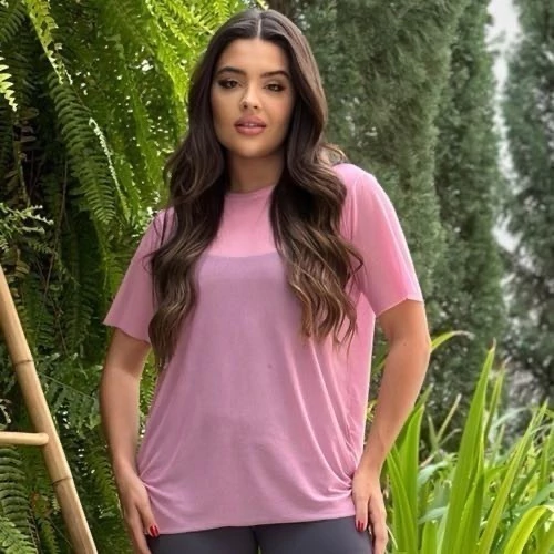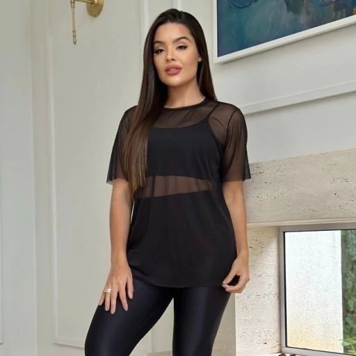Camiseta em tule, tecido leve e transparente e respiravél, perfeito para composições fitness.